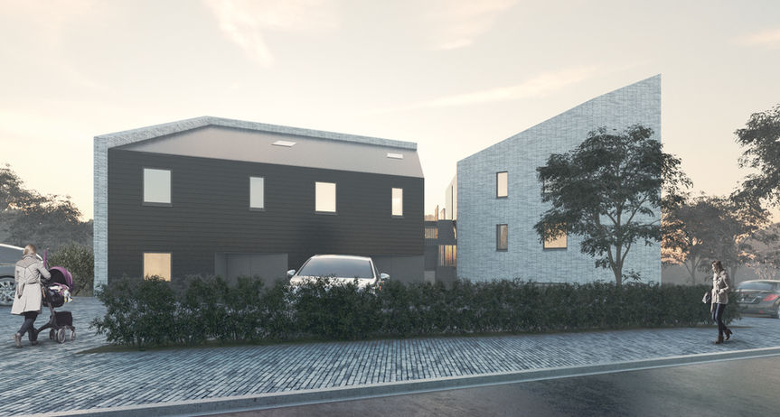 Dans le premier volume, situé en partie supérieure, nous retrouvons deux logements de type maison unifamiliale. Ce bâtiment a pour but de faire le lien avec les habitations voisines.