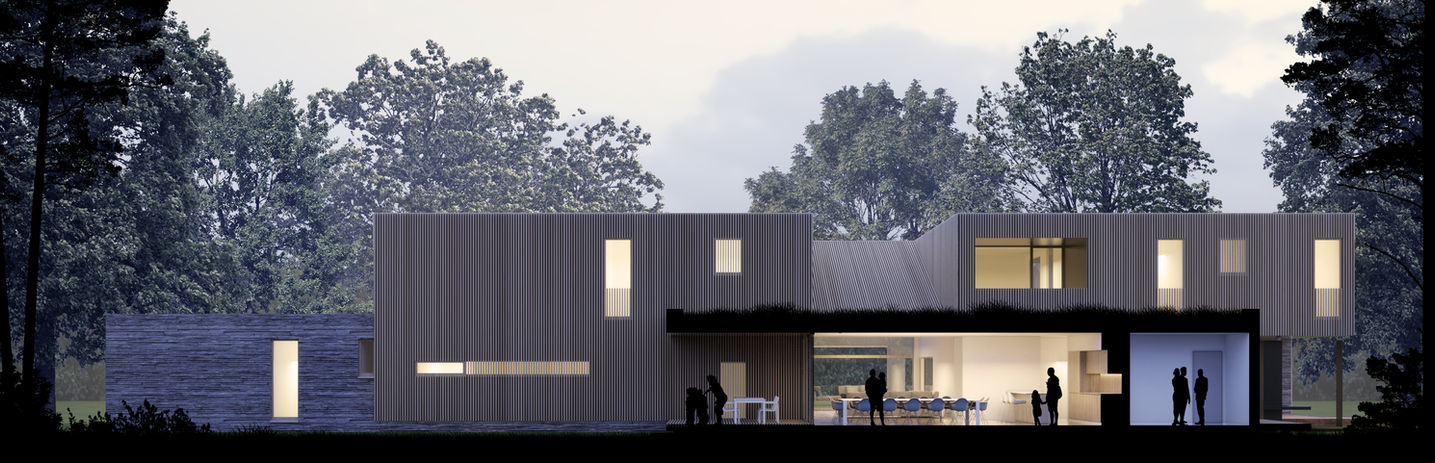 Le volume est en majeur partie à toitures plates végétalisées. La zone centrale, l’endroit de rencontre est quant à lui situé sous une toiture à un versant. Cet espace (le salon) est volontairement différent pour créer un lieu de rencontre et de convivialité. Une grande baie sur deux niveaux lui confère une proximité avec la nature. La limite entre le dedans et le dehors est quasi imaginaire. L’enveloppe du bâtiment est essentiellement composée de bardage en bois ajouré et de pierre. Le bardage est posé verticalement pour s’harmoniser et conserver le rythme des troncs d’arbres. Nous proposons l’afzélia comme essence car en vieillissant, ce bois à tendance à avoir une teinte plus claire se rapprochant de la teinte du tronc des Bouleaux.